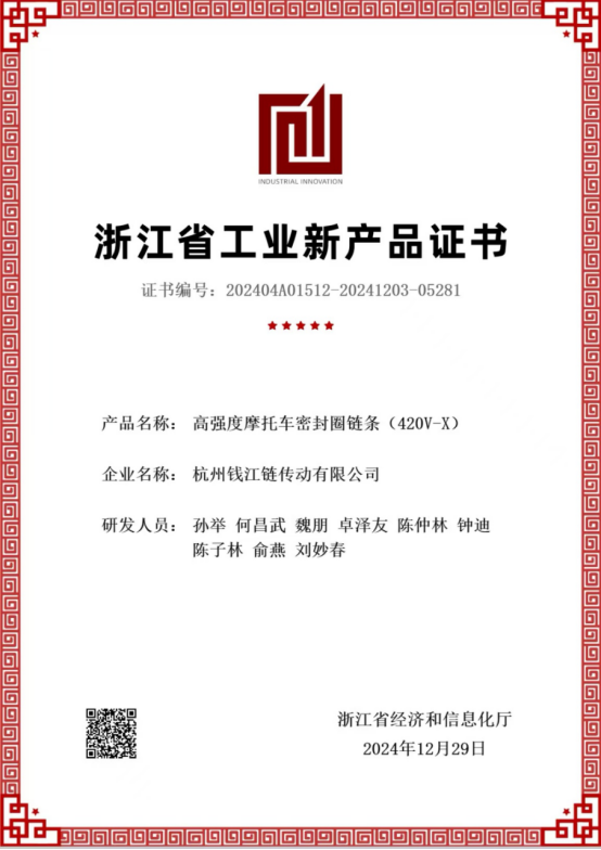 Oljeförseglad motorcykelkedja med hög hållfasthet modell 420V-O(X) Utvecklad och producerad av Hangzhou Qianjiang Chain Industries Co., Ltd. Godkänd ny produktcertifiering på provinsnivå