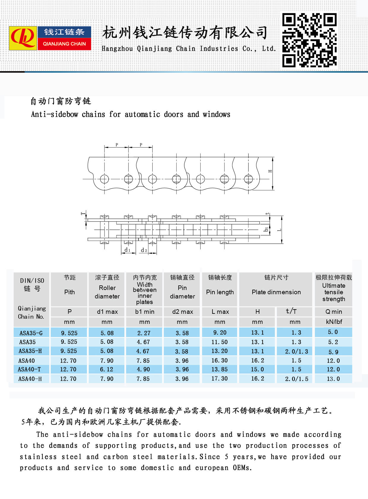 Fint hantverk åldringsbeständiga anti-sidebow-kedjor för automatiska dörrar och fönster
