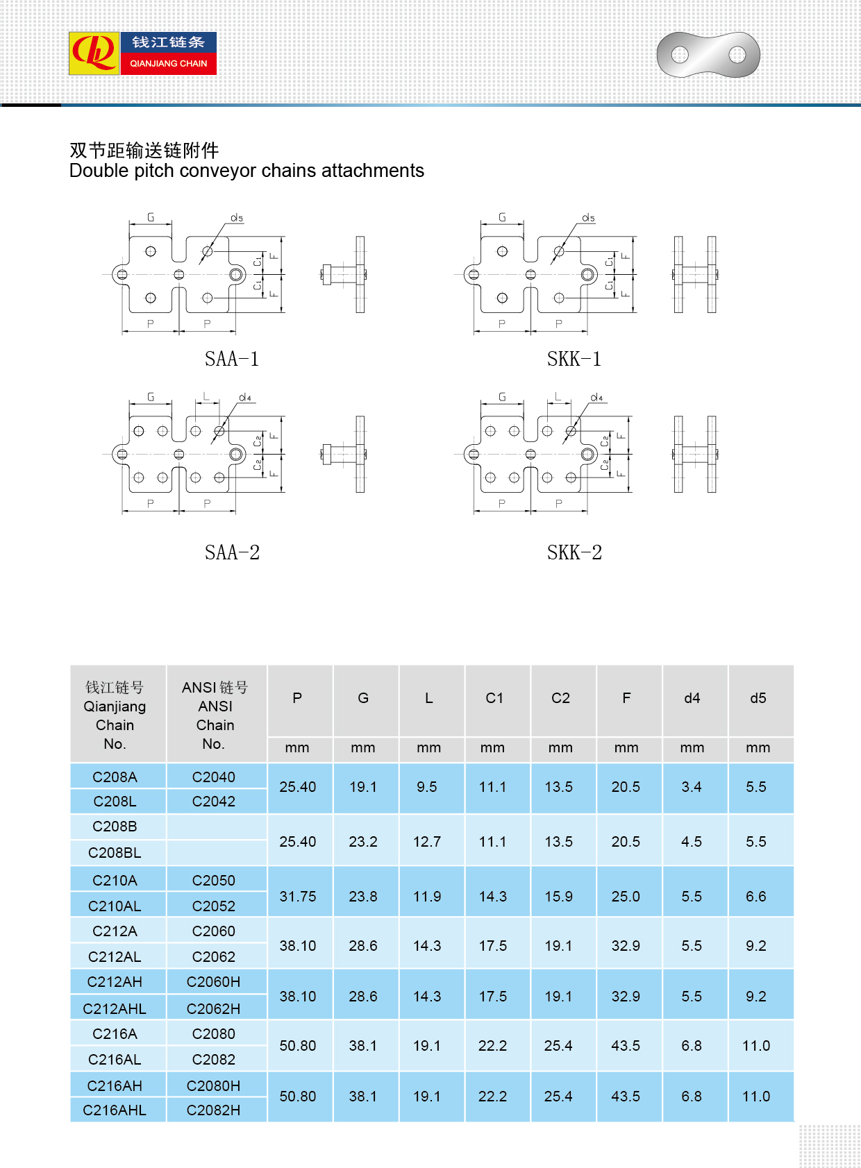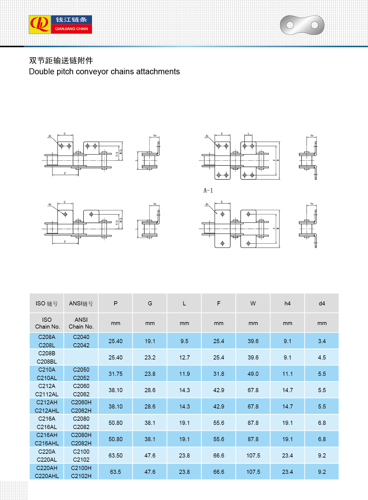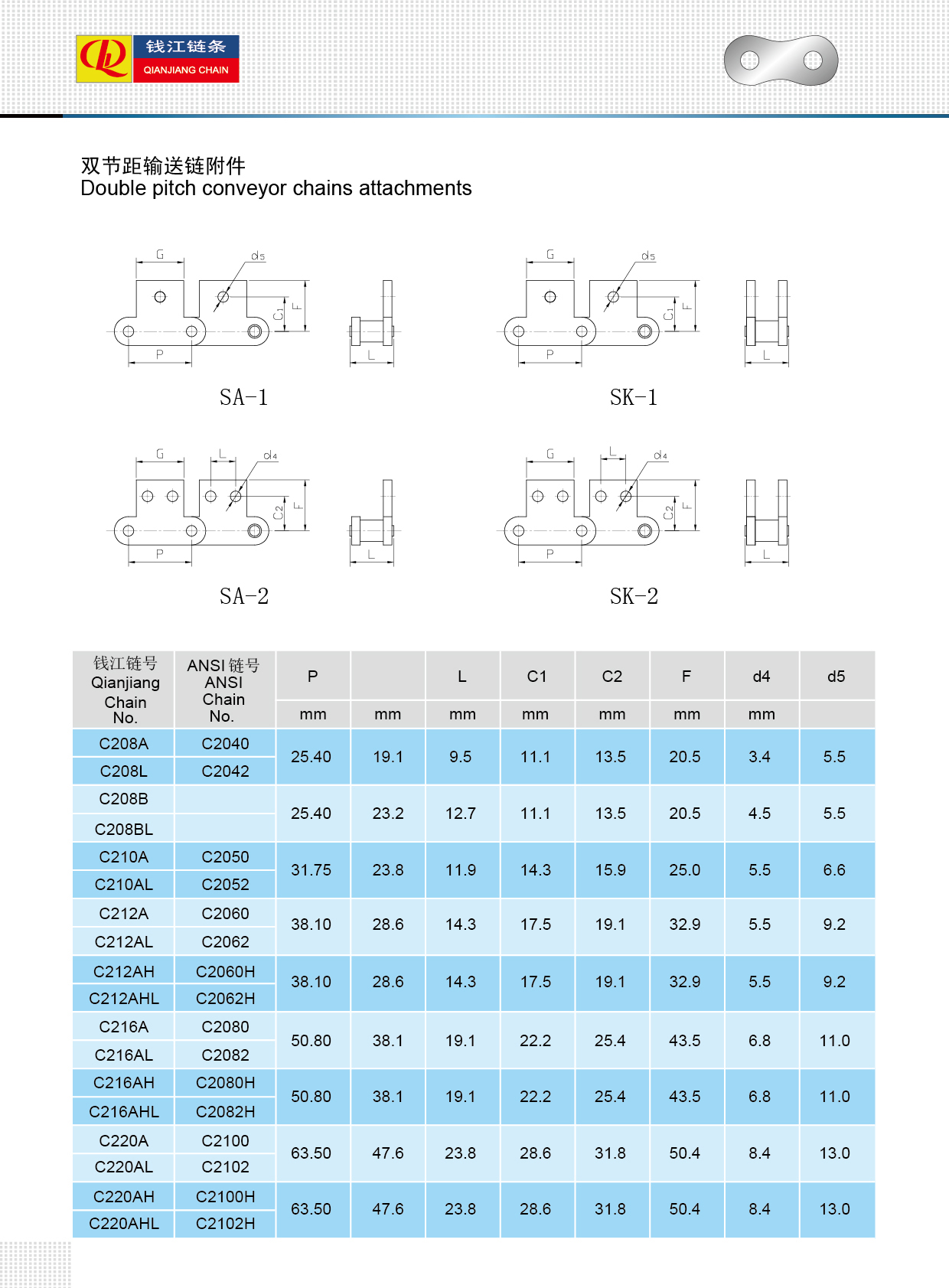 Dubbelpitch-transportörkedjor med fästen är en mångsidig och effektiv lösning för materialhantering och transportapplikationer. Dessa kedjor är designade med utökade stigningsmått och erbjuder ett lägre vikt och kostnadseffektivt alternativ till standardtransportörkedjor samtidigt som de bibehåller hög hållfasthet och hållbarhet. Nyckelfunktionen hos dessa kedjor är deras anpassningsbara tillbehör, som kan skräddarsys för att passa specifika operativa behov – oavsett om det är att transportera produkter horisontellt, vertikalt eller runt kurvor. Dessa tillbehör håller säkert föremål på plats under transport, vilket säkerställer smidig och pålitlig rörelse även i krävande miljöer.