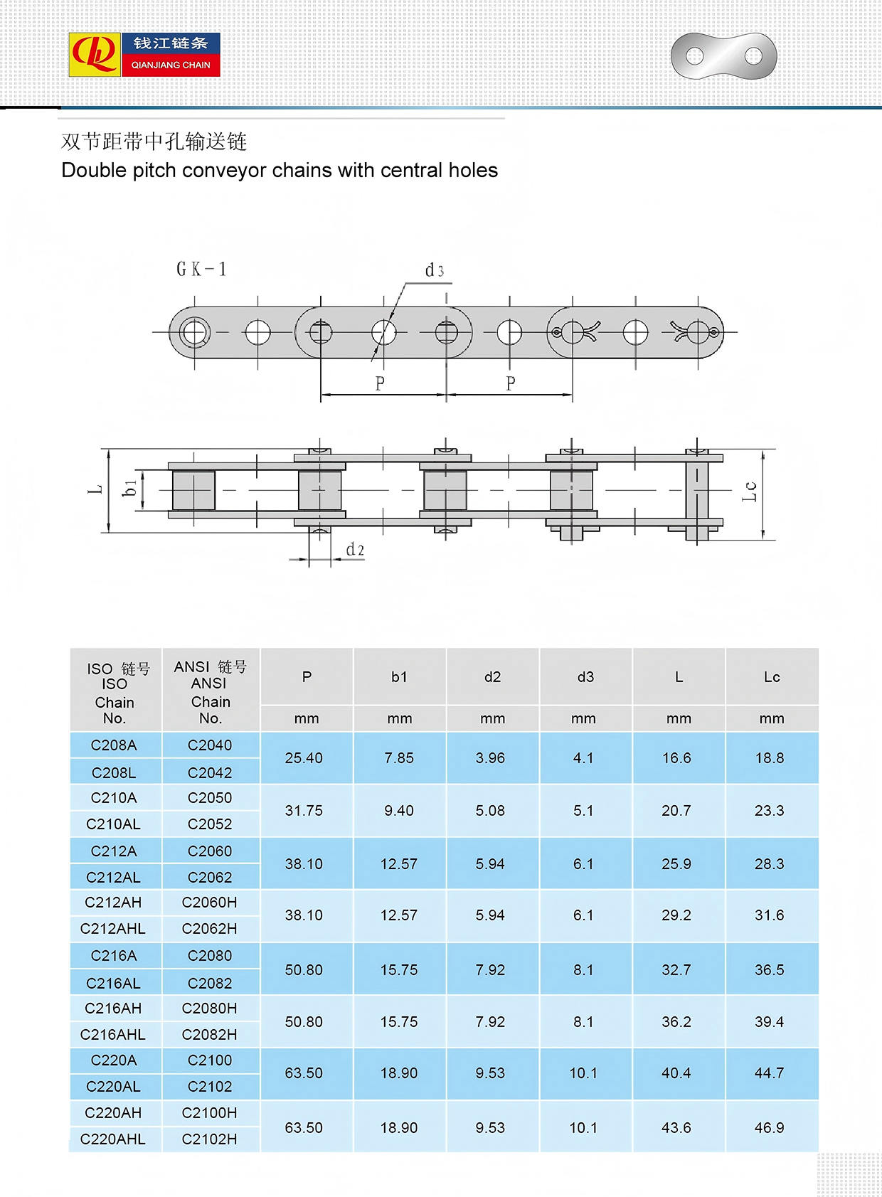 Dubbla stigningstransportörkedjor med centrala hål är en innovativ lösning utformad för effektiv materialhantering och transportapplikationer. Dessa kedjor sticker ut på grund av sin unika design, som inkluderar utökade stigningsmått och strategiskt placerade centrala hål. Denna design minskar vikten samtidigt som den bibehåller hög draghållfasthet, vilket gör dem idealiska för att transportera lätta men skrymmande material över långa avstånd utan att kompromissa med prestanda. De centrala hålen möjliggör också enkel montering av anpassade armaturer eller tillbehör, vilket förbättrar mångsidigheten inom olika branscher.