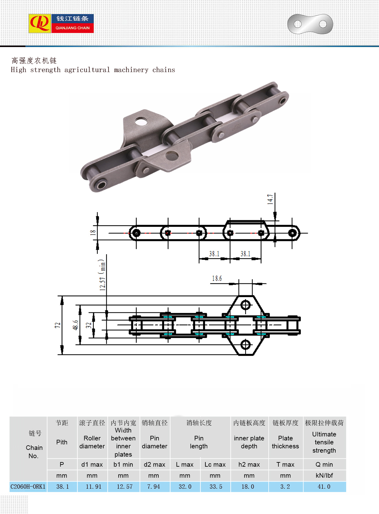Höghållfasta jordbruksmaskinkedjor har slitstyrka, styrka och livslängd och är lämpliga för olika komplexa arbetsförhållanden. Högkvalitativa legerade stålmaterial används, och kedjans draghållfasthet och utmattningslivslängd förbättras genom värmebehandlingsprocesser (som uppkolning, härdning och härdning). Kedjekontaktytan är specialhärdad, med slät yta och god slitstyrka, lämplig för högfrekvent arbete. Precisionsbehandlingsteknik säkerställer att kedjelänkarna är nära matchade, löper smidigt och minskar buller och vibrationer. En mängd olika stigningar, styrkor och former (såsom rullkedjor, tillbehörskedjor, böjda plattkedjor, etc.) kan anpassas efter behoven hos olika jordbruksmaskiner och utrustning. Används i transmissionsmekanismen för att transportera, skära och tröska av vete, ris, majsskördare etc. Att driva såskivan och gödselaxeln kräver att kedjan löper exakt och hållbart. Används på jordbrukstransportband, materialhissar, etc., för att utföra högfrekventa transportuppgifter.